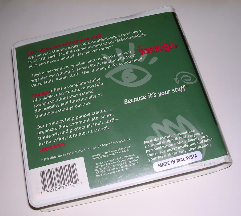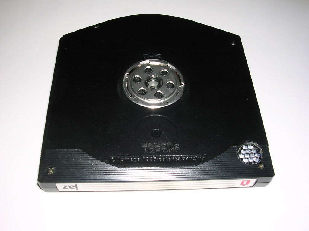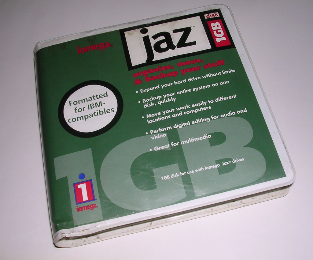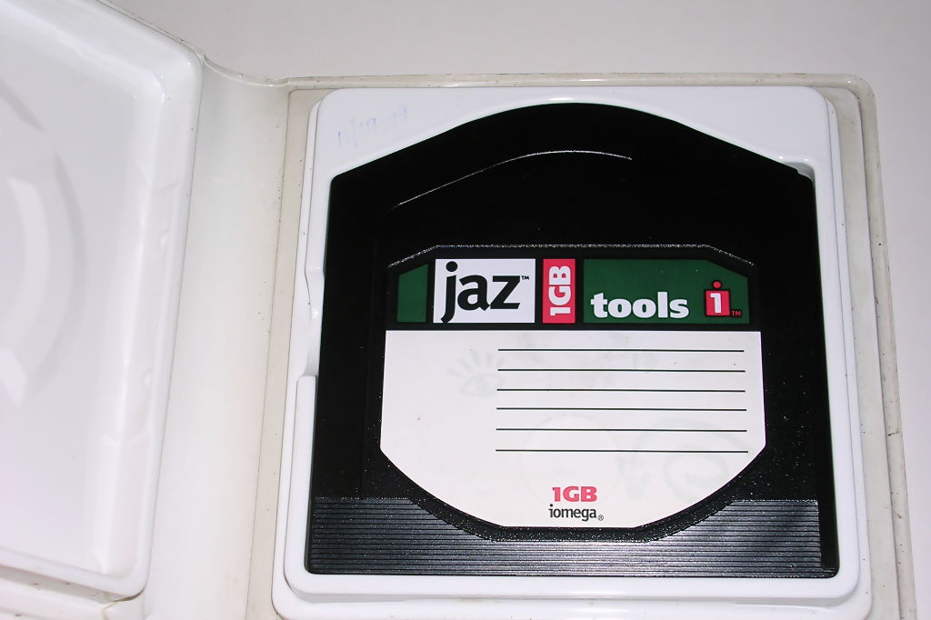 IOMega JAZ disks were hard disks with replacable platter mechanism to be used in special drives. Introduced in 1995 as 1GB, they gained popularity only as some backup appliances. Unfortunately they were expensive and prone to mechanical failures. Jaz line was discontinued in 2002.