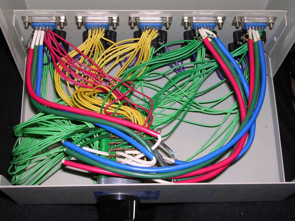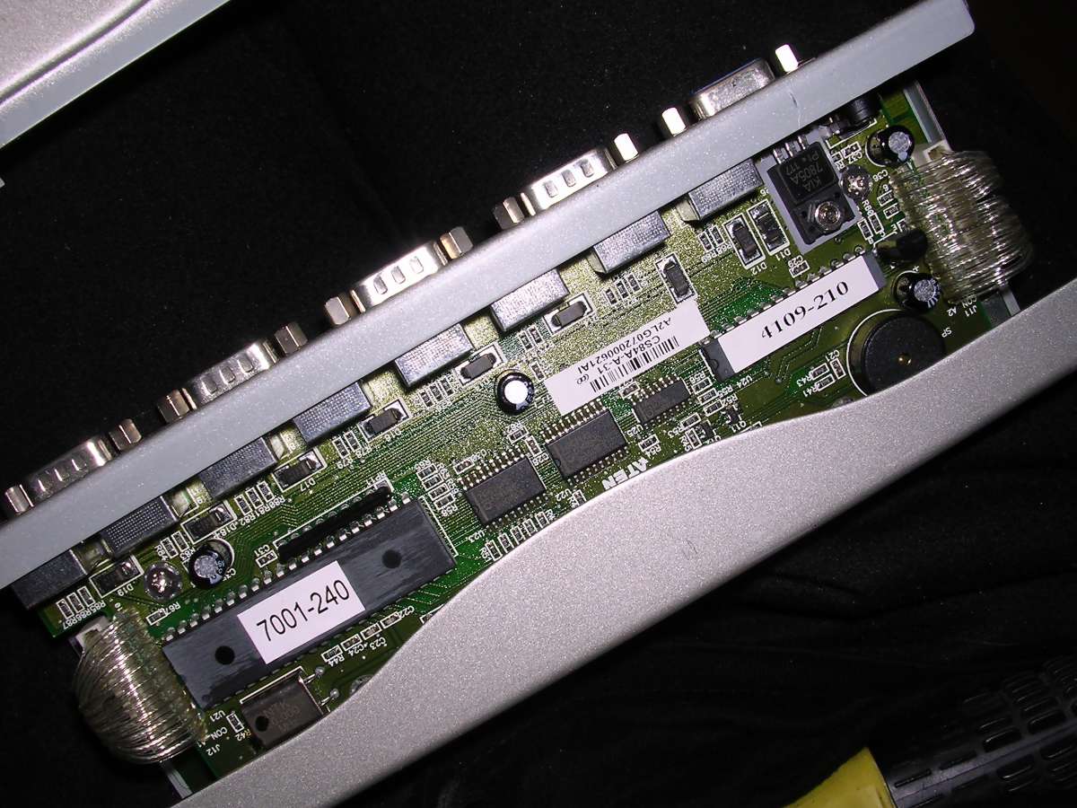 | Information: Mechanical KVM switches were made with the same technology as mechanical printer switches. They were around since 1980s and had all problems of mechanical switches plus one more - they had problems with high frequency VGA signals, making high-resolution picture's quality significantly worse. There are different versions, with DIN or PS/2 for keyboard, with mouse support or without. Inside, as always, a bunch of wires and mechanical switch. |