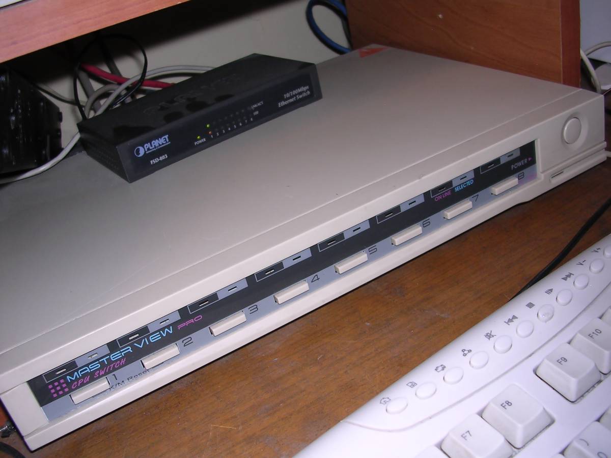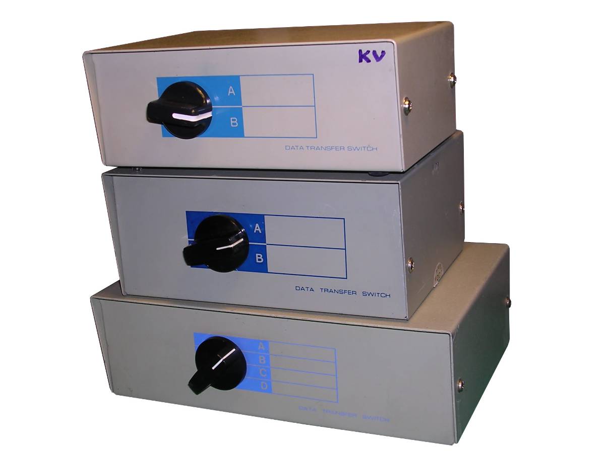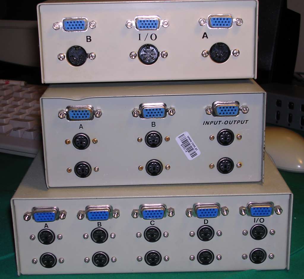 If you have a few computers but only one monitor, keyboard and mouse, in lab, workshop or server room, KVM is a very useful device - it allows to switch one console between different machines. There are small switches to connect 2 computers switched with button, even smaller ones which use key combinations, or server room-grade machines to connect 8. They may be used to switch VGA, PS/2, and later even USB.