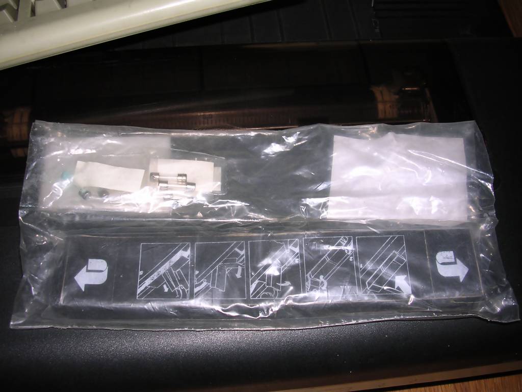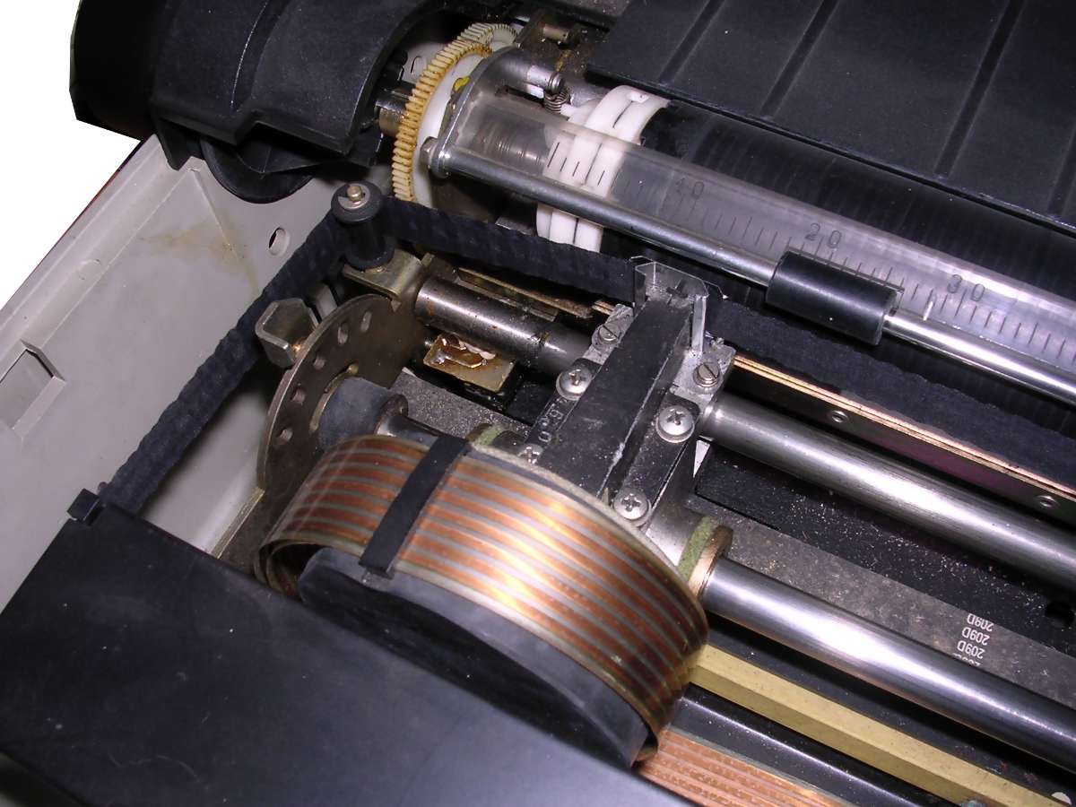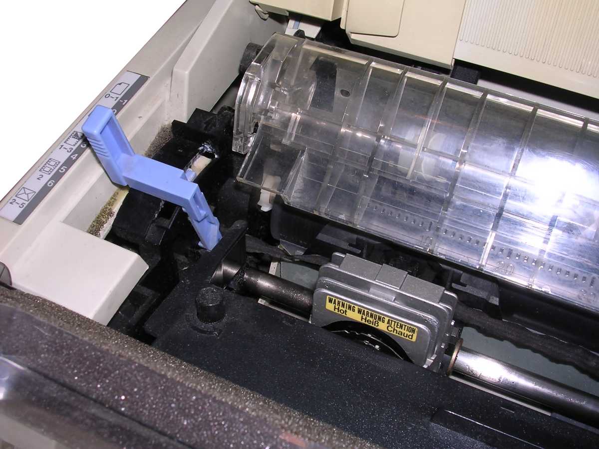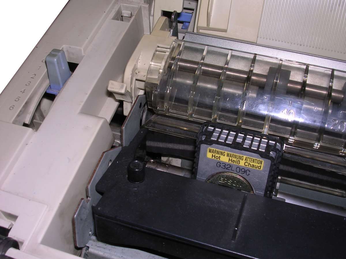 controlled by 9 separate circuits with transistors. The ribbon is not in a replaceable cartridge. Instead, the contents of cartridge were distributed in special packages. To replace the ribbon, old one had to be removed by hand. Then, the package with a new ribbon was open and the condensed ribbon was placed in empty container. Usually the set consisted of a ribbon "charge", pack of foil gloves and additional fuses for printer. I haven't managed it to run. The printer came with switches configuration not working at all (all switches off). Additionally, another setting was present on a sticker written by the ball-pen, this setting seems not to work too in parallel port.