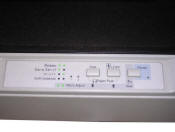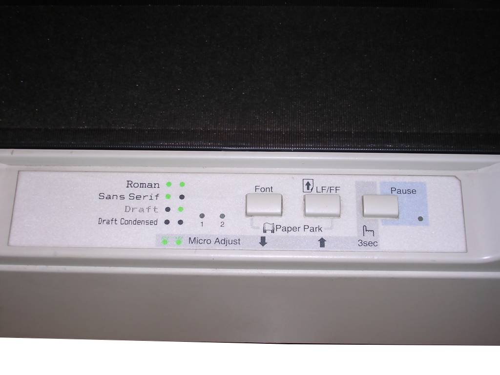 paper was fed to bottom slot, it exited printer on the rear. The printer can be configured using its front-panel lights and buttons. Powering on with FONT pressed makes Group 1 menu active. Here user can set emulation and page sizes. When FONT and PAUSE are pressed during power-on, it activates group 2, where codepage settings are set. FONT and FEED activate group 3 to set page length. There is also a "hidden" group 4, where buffer, speed and carriage return are configured by beeps. It should be noted that these printers, like all Epsons from this age, have a knob for moving paper by hand, yet it is working very slowly and is only used to remove paper jams. |