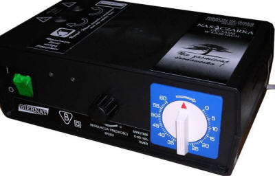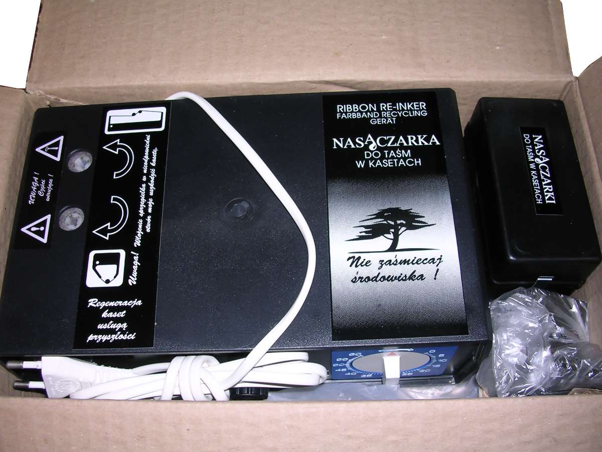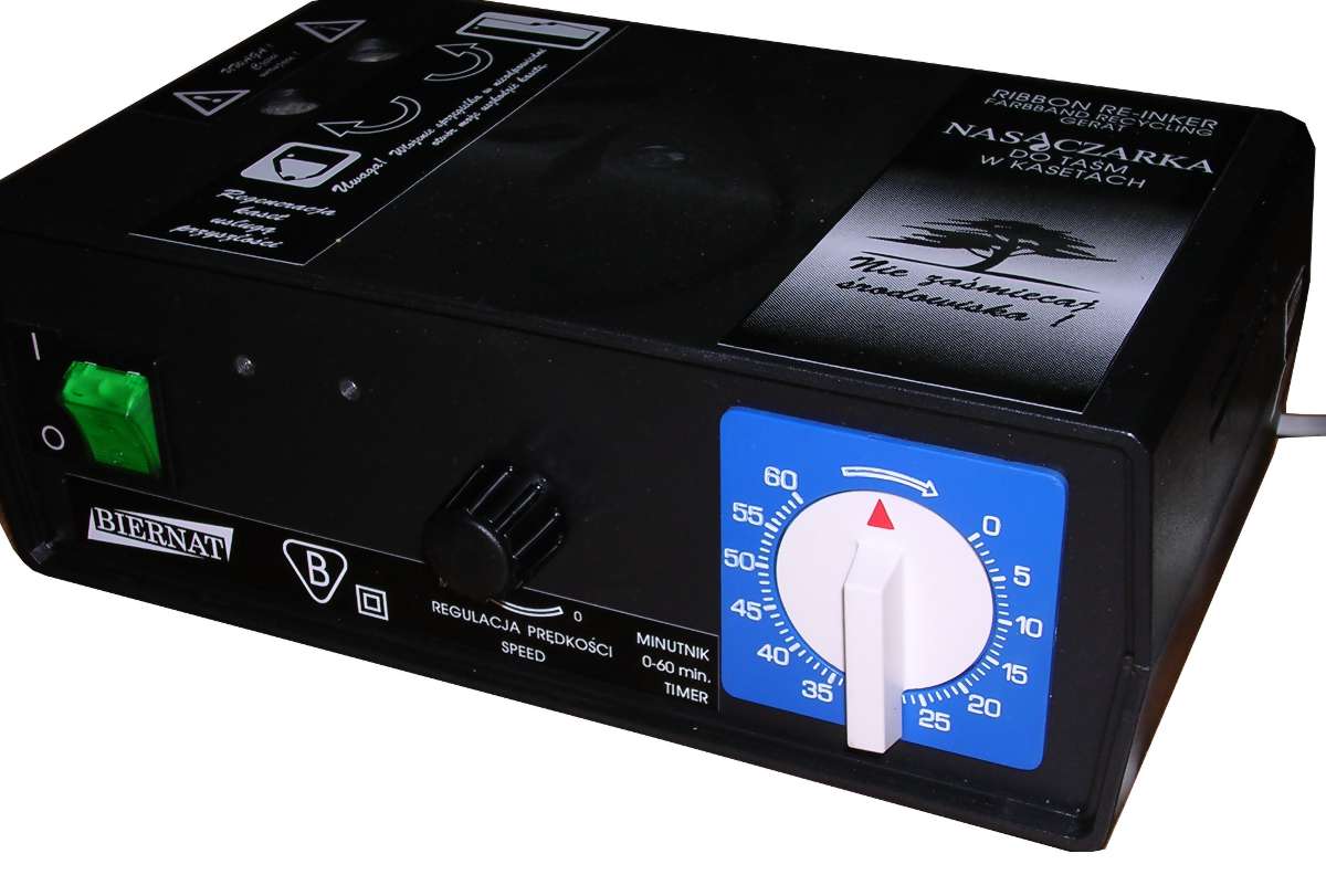 | Information: This is a simple machine: An electric motor, switch and speed regulator. Additionally timer, like one used in electric ovens. Everything in a large casing with replaceable protrusions to hold many dot matrix printer ribbon cartridges in place. The motor moves the dot matrix printer ribbon, rubbing it against wheel made of soft felt. This cylinder is periodically saturated with black ink. In some units the ribbon is rubbed against two wheels, in some with one. The ink is transferred to ribbon and after few passes it can print like a new one. These devices were made in Poland and in 1990 even a Polish patent for this device was filed, and "Młody Technik" ("Young engineer") magazine wrote about it. They were commonly used by companies to re-generate printer ribbons on large scale. These ribbons were then sold as re-generated. Usually, these devices were passed for outwork jobs, so it was even cheaper for these companies as electricity was not their. |