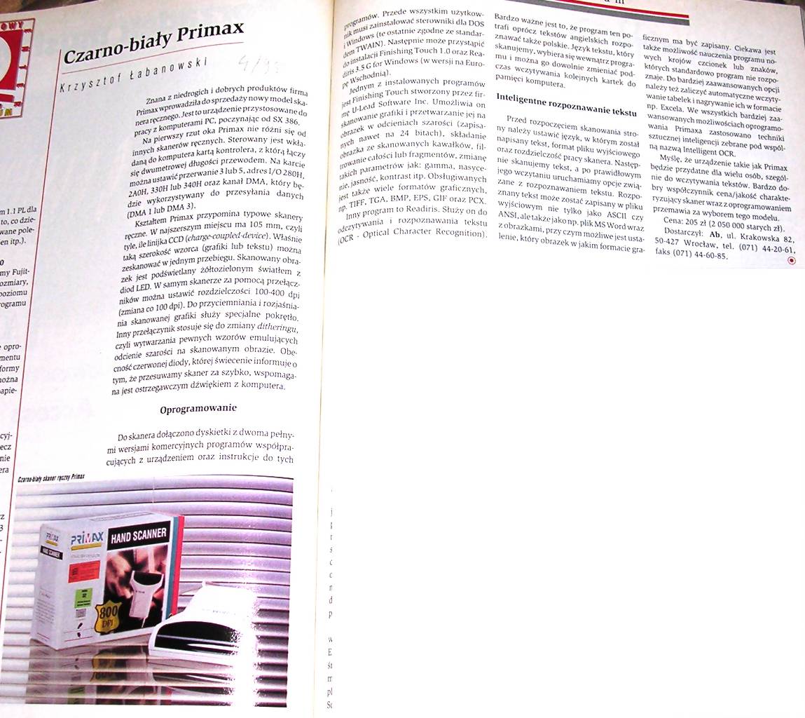 | Information: Another 400dpi handheld scanned from mid-1990s. This time it's a full 8-bit grayscale. Also connected with proprietary ISA board. This scanner had a Windows TWAIN driver, FinishingTouch image manipulation program and ReadIRIS OCR (for some unknown reasons my unit has only one ReadIRIS disk - second was lost?).
