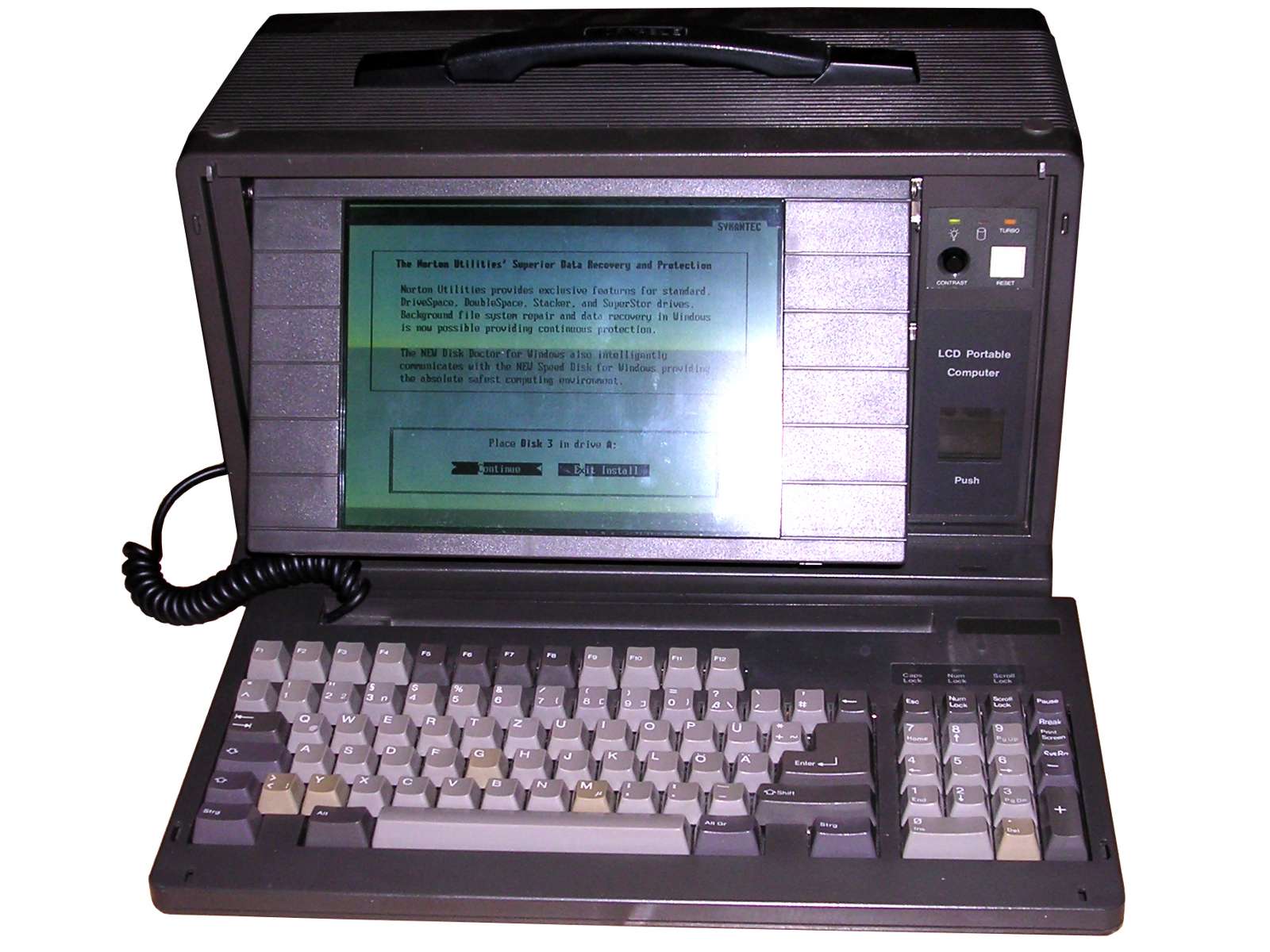 This unit, manufactured in Taiwan for Highscreen (a Vobis brand) has a 33MHz 386 processor, a math co-processor, 8MB of RAM and 80MB hard disk. As media 3.5" and 5.25" drives are installed. Full 640x480 VGA picture can be shown on grayscale good-contrast LCD panel. With proper settings, the video board can also emulate EGA, Hercules or CGA and use external displays for these. Who purchased these units? They were used as portable computers usually for some equipment, or in all situations where portability was needed, but was not critical. This unit comes from measurement system.