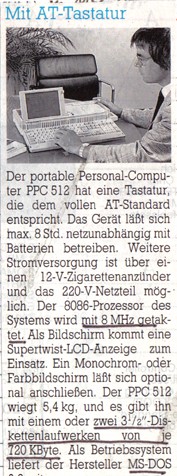 Portatil", but has German software disk and manual. Advertisement leaflet - unfortunately in Norwegian, I have no idea what's written there. On the right - excerpt from unknown magazine in German about PPC. There's a mistake about this 8088, PPC uses Nec V30 processor, which is 8088 compatible.. |