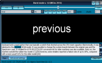 Burst Mode) [20141229] A software which helps to "read" any text faster by displaying one word, or x words (chunk) a time, "transmitting" text with specified word rate. This allows to quickly read quite large articles or publications, maybe not to get a full understanding but certainly to get basic idea what is it about. Highly configurable (text font/size/color, background color/texture/align, adding time to longer chunks, color morphing), Qt-based, GPL code (but buggy and full of terrible hacks). I've made the first version of FTD (Fast Text Downloader) in Pascal in 2003, it was working in DOS window or VGA screen using Figlet-like fonts or Pascal's bitmap fonts. Later, I've re-written it in Delphi and shared quite hermetically (MITK FTD, TC/TSG FTD, later revised as GGPFTD after MITK-TSG splitting, later "Burst Mode 0.5"). In 2013/14 I decided to re-write it in something useful (Qt) using Burst Mode 0.8's code as a base and GPL the code. If it displays black on black, use Text Color (TC) to fix it. Make sure that srrc.ini configuration file is writable. In Windows it's in program's directory, in Linux it's in ~/.srrc.ini, the structure is the same. |