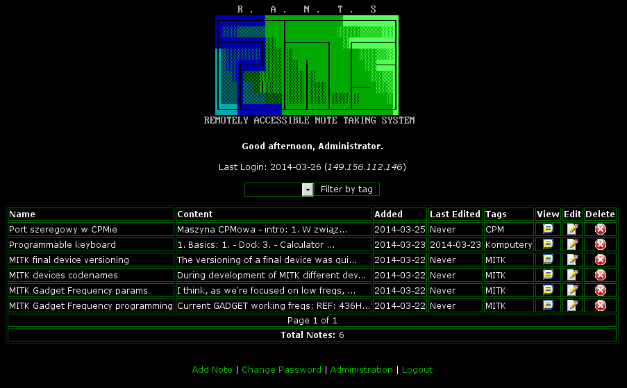 [20140328] RANTS (Remotely Accessible Note Taking System) was a small program written in PHP and MySQL to keep small notes on a server. It was written in 2006 by Eric O'Callaghan, but his web site looks dead now and it's hard to get RANTS source. This is a modified version of original RANTS, these modifications involve: - Notes may be maximum 8192 characters long. - Characters '<' and '>' may be used in notes. No HTML there. - Each note may have space-separated tags, notes may be filtered by them. If no tags are used, it automatically gets "General" tag. - Dividing into pages finally works, so there's no note limit. Requirements: MySQL database, PHP server, maybe SMTP. Multiuser mode not much tested as I've used it to store my personal notes from administrator's account, but it *SHOULD* work. Read README for installation details. After installation theme may be changed by editing CSS file and images.