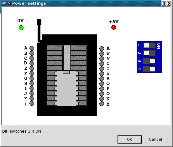 This tab is very important. As you've seen by looking at IC tester hardware, Tester's board has 4 DIP switches connected to power or ground, but it can support more with user settings. For example if you check many chips in 24-pin casings, and they need power connected to pin 24, you can use 5th DIP to connect power to pin 24. This window allows to define these additional switches and they're taken to account when suggesting you power configuration before test. Double-click on a selected DIP switch function to change what is connected to it: Power (Vcc) or ground (GND). There may be "empty" DIP switch too, it's just disconnected so it's only drawn as present, but not used. Then you have to specify socket's pin which is connected with this DIP switch. You can always revert to default setting by pressing Set defaults button.