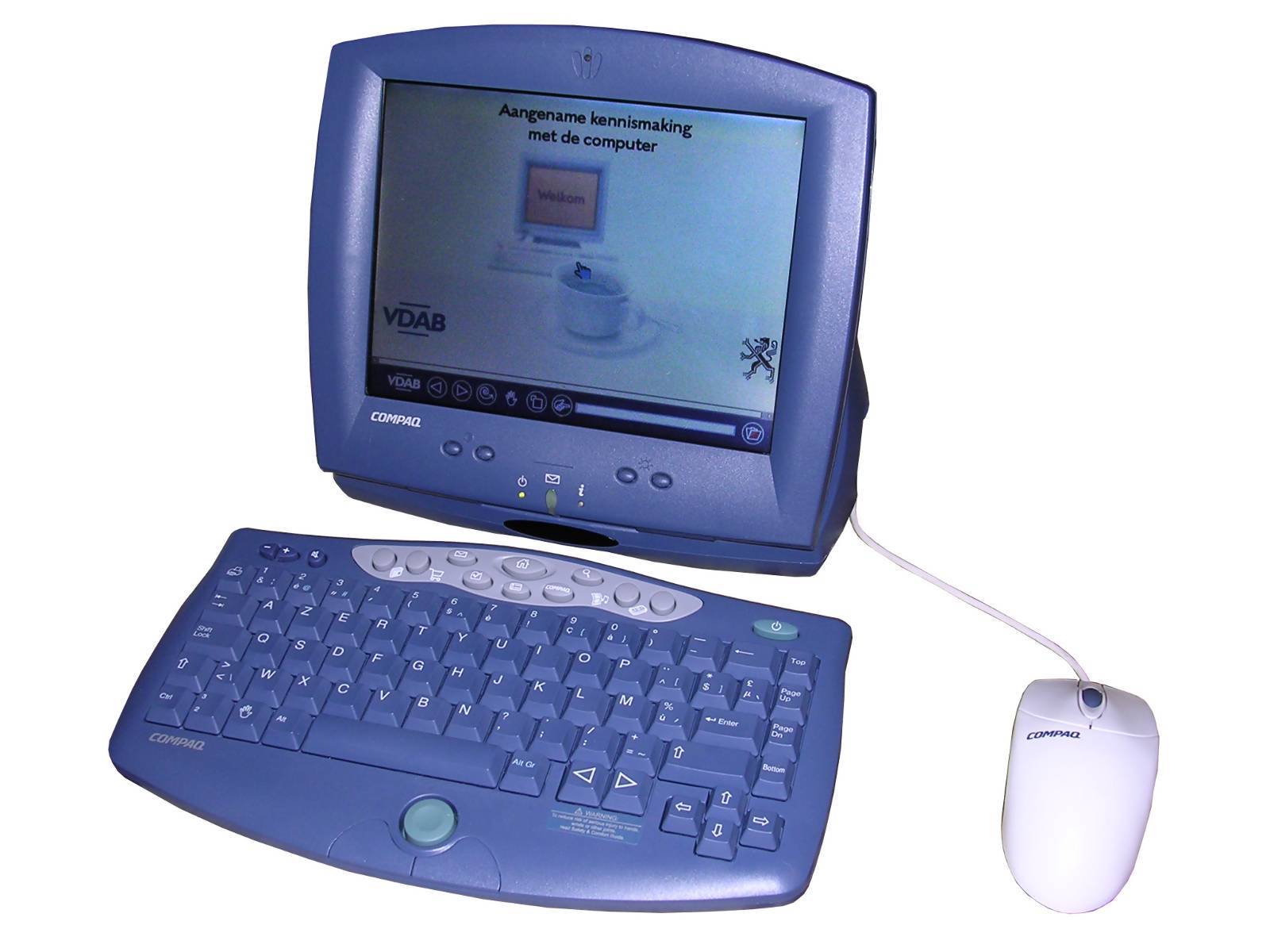 been retried for the next, at least, 10 years. This machine is one of these "Internet-browsing terminals" made by Compaq, powered by BeIA, being in fact a small, embedded PC with AMD K6-2 processor clocked at 266MHz, 32MB of RAM and 16MB flash chip as a disk. It has USB ports to connect mouse, keyboard or similar devices and a built-in modem to connect with Internet. There is also a sound chip and speaker built-in. The LCD is a small, 10-inch panel with 800x600 resolution and nice color representation. Customized keyboard in which function keys have been replaced by custom ones, is wireless with infrared connection (powered by 2 AA batteries) and TrackPoint-like mouse. To expand disk space, it is possible to use CF card slot. There were two versions of this terminal, white one and blue one, this is a blue one with a bit different BIOS construction. This particular unit has been programmed for VDAB, a Belgian Internet provider who sold it as a device to access the Internet for people who don't want a full computer. |