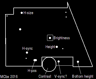 As these machines had CRT operating for a long time, it is normal that it quickly went out of operation parameters. Picture may be smaller, larger, too bright or misaligned. The drawing below shows where on CRT board (looking at the metal part on the left side of terminal) different regulation devices are placed. If you tune picture height, remember that usually people see the machine from a bit above, so having the front cover makes the picture on the top edge of CRT a bit lower.