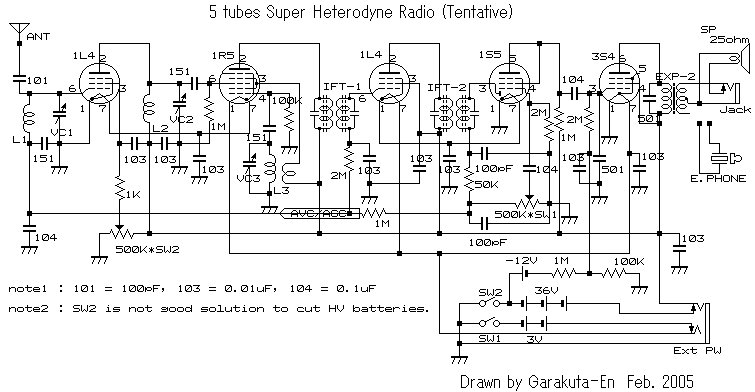 回路上で問題点が3つありました。一つ目は、1S5のフィラメント電圧の供給の仕方。二つ目は、上述したAVC/AGC回路。三つ目は電源SW