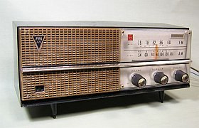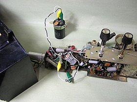 FM部を除けば極く標準的な5球(いや整流管が無いから4球)スーパなのですが、実際動作させると「感度は低いが、ゲイン(利得)は高い」といった感じ。だから、何やらガサゴソと騒々しいんです。(コンデンサや球を入れ替えて、ちゃんと調整すれば感度も上がるのでしょうけど)