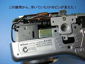 CFソケットをためつすがめつ覗き込んでいたら、1本のピンが欠けているのが見えます。外装を開けて覗くと、ピンが1本後ろに押し出されているのが見えました。(元々の不良のような気もしますが、自分の出し入れが粗っぽかったせいかも?)