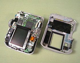 外回りのビス8個を外して前後2つに殻割りし、基板の2箇所のコネクタから薄いフレキ・シートを外して、電池からのリード線の半田付け2箇所を外せば、外装と内部構造が完全に分離できました。(簡単なもんです。z(o^; でも、ビスは数種違ったものを使っていたので、戻す時一箇所差し間違えたら、孔がユルユルに)