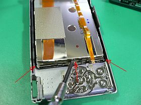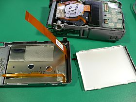 “液晶ユニット”(の前外枠)は、本体裏蓋に両面テープでぴったりと貼り付けられているので、全体を剥がすのが結構厄介です。