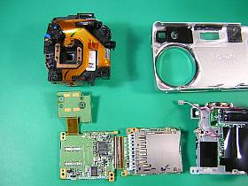 写真の<クリック>で液晶部・台座を外し、レンズ部留めビス等を外した状態、更に写真を<プッシュ>すると、本体を裏返し、CDD部を分離する寸前の状態。 (尚、全部の部品は写ってません)