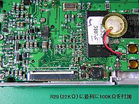 R29(22KΩ)の箇所が効果的で、そこへ並列に調節用抵抗(100KΩ位)を付加するのがベストでした。(≒18KΩ)