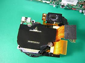 レンズ+CCD部は、2つのフレキを外すだけで、メイン基板から外せるのですが、フラッシュ部へのリード線が上側を横切っているので、これを上手く外しておかないと。