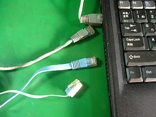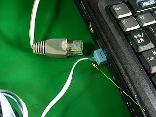 使う度に出し入れしていたThinkPad T42で使っていた短頭有線LANプラグ(青色)の近くが断線してしたようで、これでの伝送が出来なくなりました。(左写真)