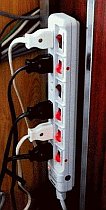 当初は、大元に一括入切り型のマルチ・コンセントを使っていました。これだと5箇所全部に通電されますね。ところが、夏場の暑い時に、狭い所へ手を突っ込んだ時、うっかり発熱型(?)ACアダプタに触ったと思って下さい。