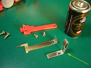 以前、修理して持って行った玩具(中古)の汽車の電池電極が折れたとのことで、持って帰って再修理を試みた。