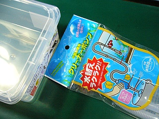 DAISOで、「ポリ製シューズケース」(\108税込み)と「手動クリーナポンプ」(\108税込み)を買って来て、これらと掃除機とを組み合わせた「減圧ボックス」で、水分の吸出しをしてみようとした。