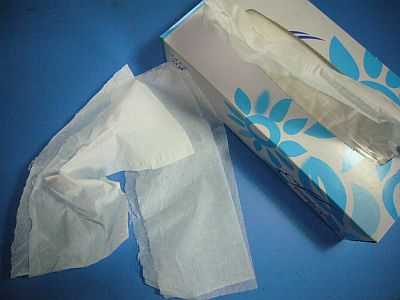 ティッシュを箱から、急いで取り出そうとして、千切れ千切れになってしまい、幾枚も取り出す破目になる。