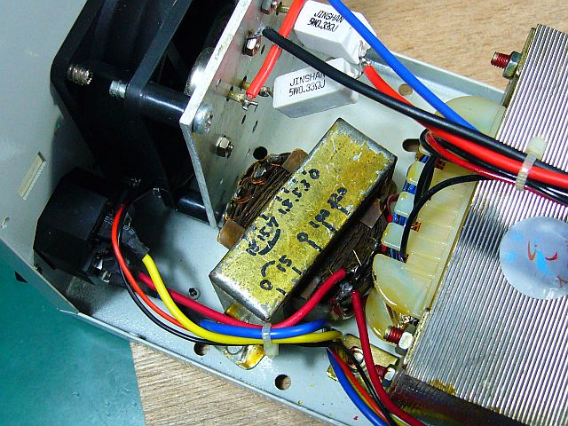 (私の処置として、)物置小屋から、昔、アマチュア無線をやっていた頃に使っていた旧い電源トランスを探し出して来て、それを使って、AC電圧をステップアップしてみた。(図3