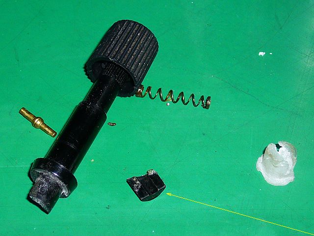 「回転式スイッチ」部を分解したら、「小真鍮棒」を回転させる為のレバーの片側が折れていた。(図3