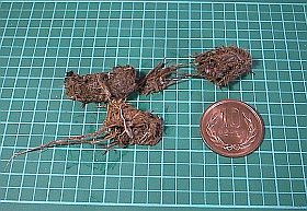 多分、木材だろうと思いますが、太さ0.2〜0.5mmφ、長さ1〜2cm程のものが団子状になっています。
