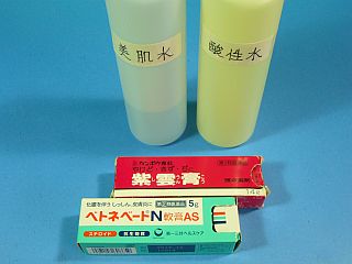 に発生していた皮膚炎を、一発目は「ステロイド剤」で抑え、それが再発したので、これを「紫雲膏」と「酸性水」+「美肌水」(左写真)で再度抑え込みました。
