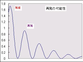 それが、治療を始めた後で出て来ると、(漢方では)「好転反応」とか「瞑眩(めんげん)」とか呼ばれているようですが、私には単なる『(少し弱め?の)再発』のように思えます。(左図)