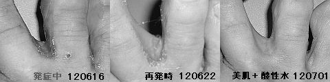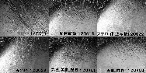 私の皮膚炎は、実験だと思いながら“自家治療”をして来ましたが、今までの経過は左モノクロ写真(左写真<クリック>でカラー)の如くで、2012年7月3日現在では、かなり治って来たようだし、気のせいか?薄っすらした“産毛”も見えます。(数字は、年月日)