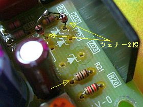 で、買って来るまで、もう1枚の基板から拝借して、直列接続にして“上限電圧”を2倍に!(左/上写真)