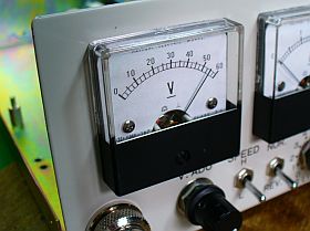 固定電圧の方は、特に値を見る必要は無いので、直接出力してありますが、可変50V系は、従前通り電圧値、電流値をメータで読めるし、右端のスイッチで出力のON/OFFが出来ます。