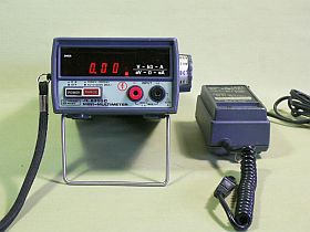 実質3桁表示、単3型4本の電池駆動式。付属のACアダプタは、お尻に咥(くわ)え込む面白い方式で、本体容積は廉価版マルチメータの約3倍ほど。(左上写真&<クリック>)