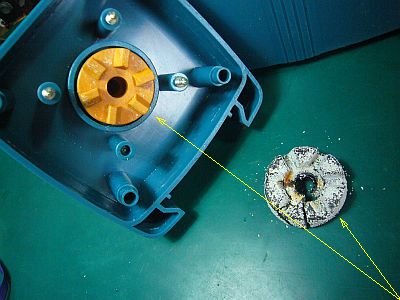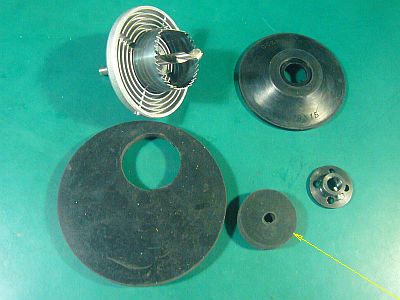 こんなものが中に、くっ付いていた!どうやらこれは、“回転駆動板/クラッチ板”の片側らしい。それがモロモロ状態になっていた。(図2<クリック>)