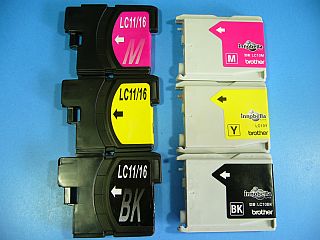 取り敢えずは、実験用として安いLC11タイプのインク・カートリッジを購入。(左写真の左側 4色総費用\760送料込み)