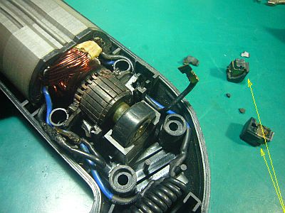 Also, "carbon brush" said "cannot be used anymore" because the "Pushing spring" at the rear is too compressed.