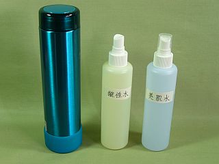 酸性水」は、「美肌水」と一緒に使うので、百五円ショップで買った噴霧式のプラ・ボトルに入れてありますが、一回の使用量がそれ程多くないので、減らない!(左写真の中央、右端)