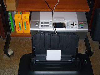 また、紙送り機構は、DCP-385Cなどにあったような紙詰まりは起き難い構造なのだが、本体を置く棚が狭いので、使用時に本体を引き出さねばならず、大不便!(図1)