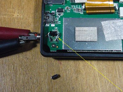 無理に取り出すのが難しかったので、(使う予定の無い)TV用アンテナ・コネクタの半田付けを外して、主基板を取り外した。(図4<クリック>