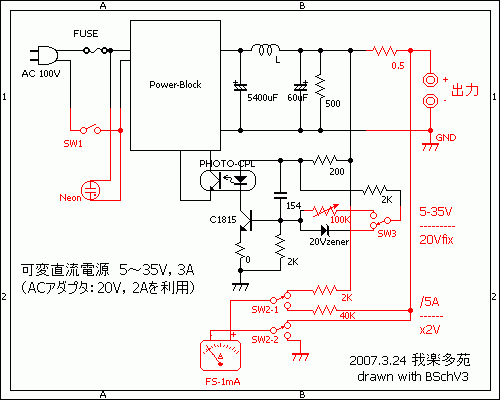 結果、予想外に上手く行って、max35V,max3Aの(比較的安定な)可変DC電源が出来上がりました。