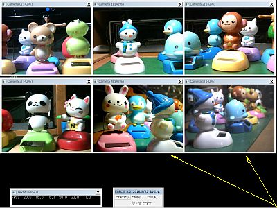 今回は、4台のC210群に、異種カメラとして、ELECOM製UCAM DLA200Hを4台を加えた系で試してみたら、「試験プログラム(UCamEWC.exe)」で、4台+1台まで映像表示が出来た。(図3 矢印が「UCAM DLA200H」1台の映像)