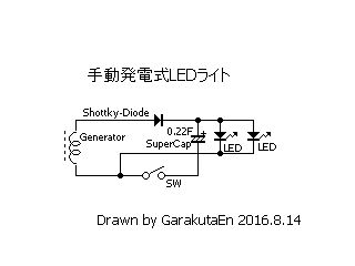 ということで、少し、中を改造して、「発電直点灯方式」と「スーパーキャパシタ付加方式」とをスイッチで切り替えられる「完全手動発電式LEDライト」にしてみた。(動画2<クリック>)