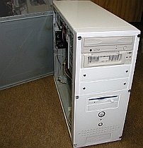 先の土曜日に手頃なATXケース(\1,480税込)を見付けたので、これにCPU(Duron 600MHz \1,280)とメモリ(DDR400 SDRAM 128MB/PC3200 \1,080)を買い足して組み立てました。