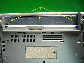 「キーボード押え兼電源SWカバー」は、普通大型ノートPCではフックだけで留められていますが、これはバッテリ裏のビスを3本外さないと外せませんです。_左写真_