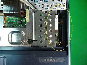 で、キーボードを調べていた時に気が付いたのですが、中に無線LANカードが刺さっていましたし、またパームレストにはシールが貼り付けられていました。_左写真&<クリック>_