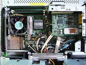 鉄板/金属覆いを外したら、メイン・ボードが見えましたが、まず、CPU冷却ファンに付いた埃が気になった。_左写真_