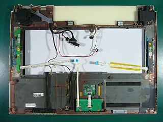 やはり、キーボードが一番先だ!その後、2/3を占めるアルミ板を外し、更に種々のフレキ・ケーブルを全部外してから、「上蓋」を分離した。